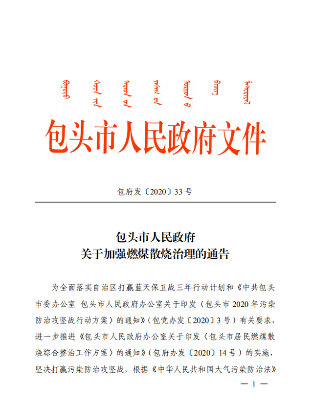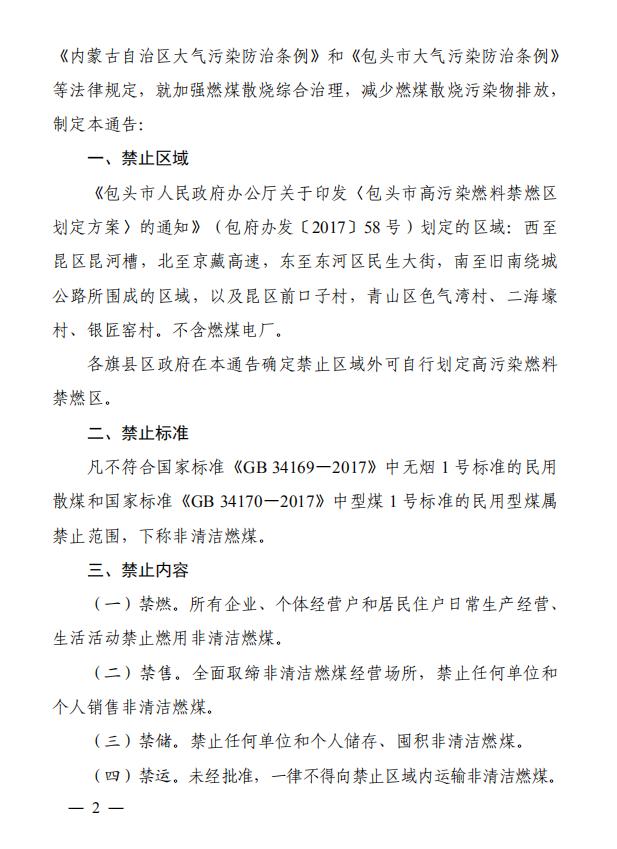 为全面落实自治区打赢蓝天保卫战三年行动计划和《中共包头市委办公室包头市人民政府办公室关于印发〈包头市2020年污染防治攻坚战行动方案〉的通知》(包党办发〔2020〕3号)有关要求,进一步推进《包头市人民政府办公室关于印发〈包头市居民燃煤散 烧综合整治工作方案〉的通知》(包府办发〔2020〕14 号)的实施,坚决打赢污染防治攻坚战,根据《中华人民共和国大气污染防治法》《内蒙古自治区大气污染防治条例》和《包头市大气污染防治条例》等法律规定,就加强燃煤散烧综合治理,减少燃煤散烧污染物排放制定本通告: