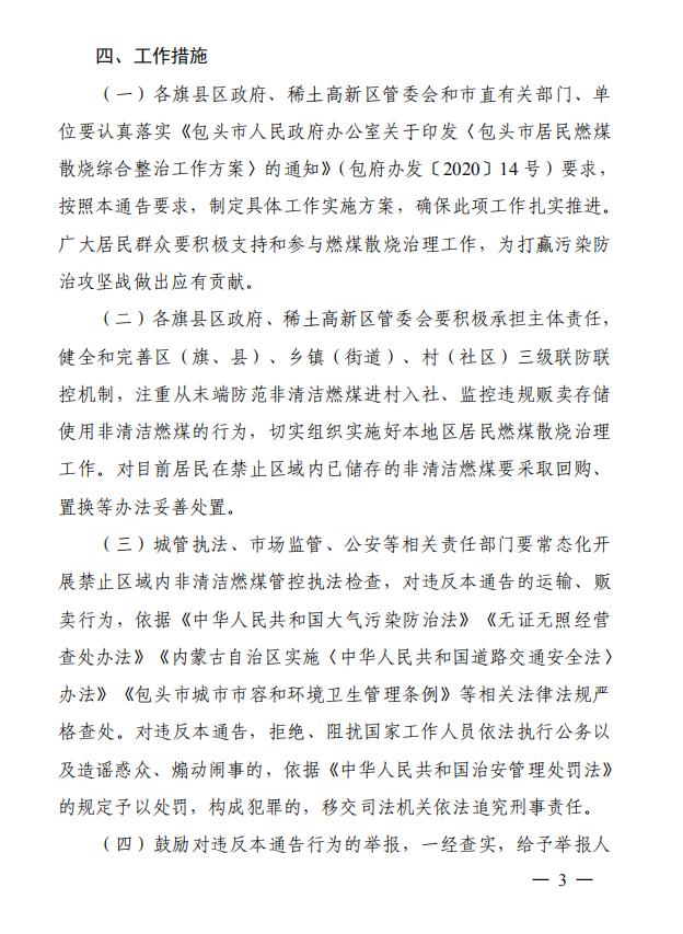 为全面落实自治区打赢蓝天保卫战三年行动计划和《中共包头市委办公室包头市人民政府办公室关于印发〈包头市2020年污染防治攻坚战行动方案〉的通知》(包党办发〔2020〕3号)有关要求,进一步推进《包头市人民政府办公室关于印发〈包头市居民燃煤散 烧综合整治工作方案〉的通知》(包府办发〔2020〕14 号)的实施,坚决打赢污染防治攻坚战,根据《中华人民共和国大气污染防治法》《内蒙古自治区大气污染防治条例》和《包头市大气污染防治条例》等法律规定,就加强燃煤散烧综合治理,减少燃煤散烧污染物排放制定本通告:
